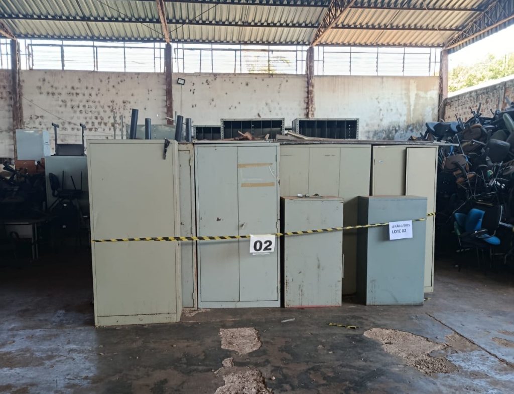 O leilão está organizado em nove lotes, incluindo desde cadeiras e sucatas até sistemas de refrigeração. Cada lote apresenta uma ampla variedade de itens: