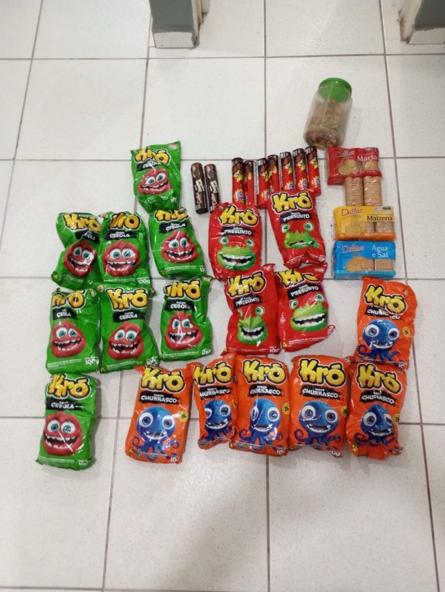 Foram recuperados itens alimentícios como salgadinhos e bolachas, levados do comércio.