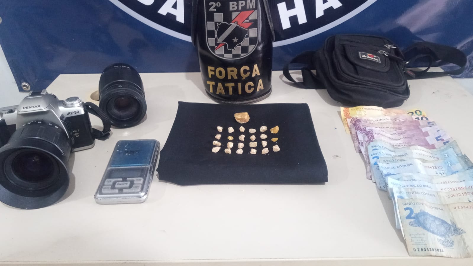 Durante a abordagem, os policiais realizaram uma busca pessoal e encontraram 23 pedras de crack e uma pedra da mesma substância ainda não fracionada, totalizando 9,7 gramas. Além disso, foi apreendida uma câmera fotográfica, que o abordado afirmou ter recebido como pagamento por drogas.