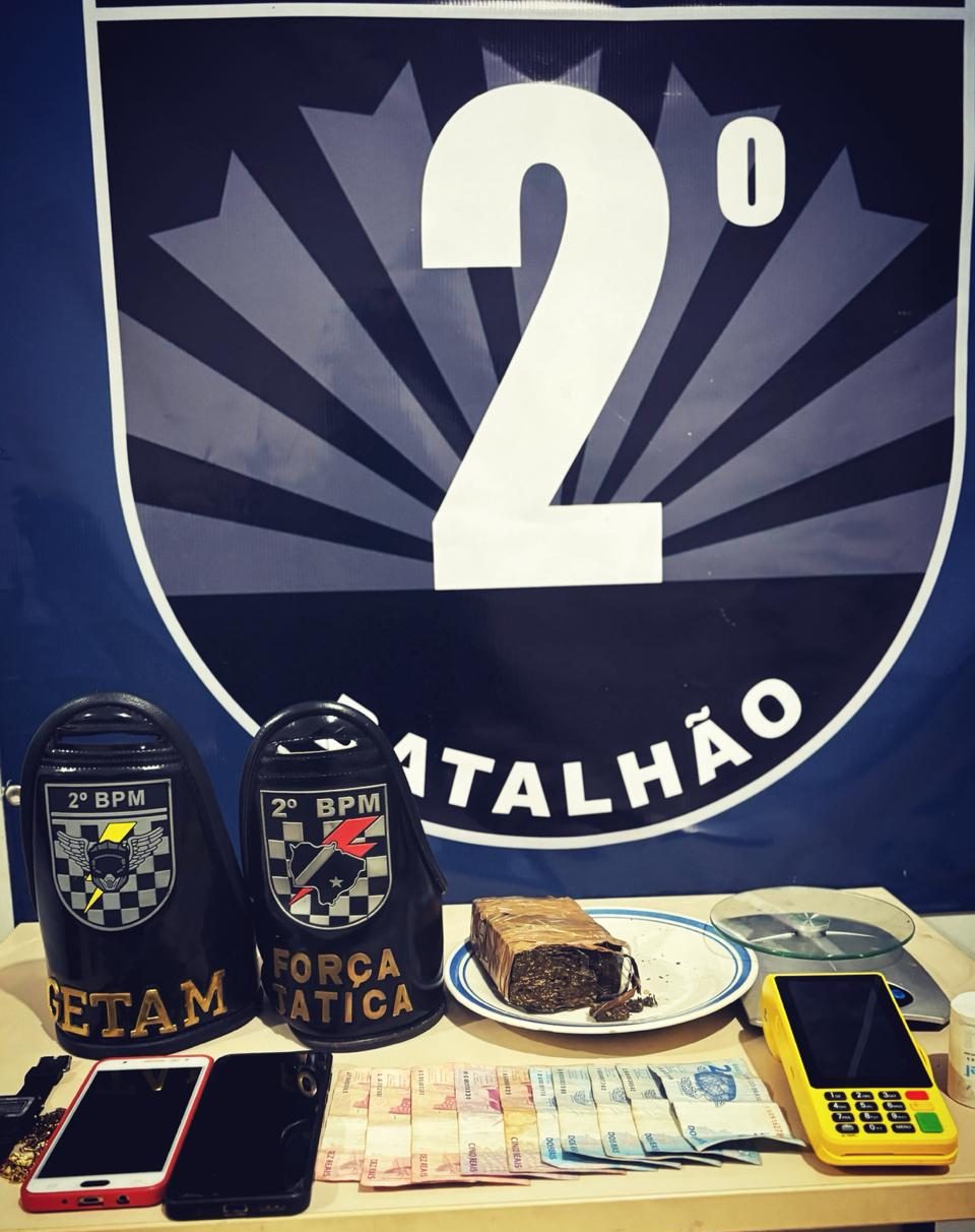 Na abordagem, o homem, de 24 anos, confessou estar vendendo entorpecentes e indicou o local onde escondia o restante da droga. Os policiais localizaram meio tablete de maconha, pesando 290 gramas, além de materiais usados para preparar e vender a droga.