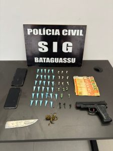 No imóvel, a polícia apreendeu 31 porções de cocaína, 17 porções de crack e pequenas quantidades de maconha. Além dos entorpecentes, foram encontrados aparelhos celulares, dinheiro em espécie, um simulacro de arma de fogo e uma lâmina de 15 centímetros. Inscrições relacionadas a um grupo criminoso organizado também foram identificadas e registradas no inquérito policial.