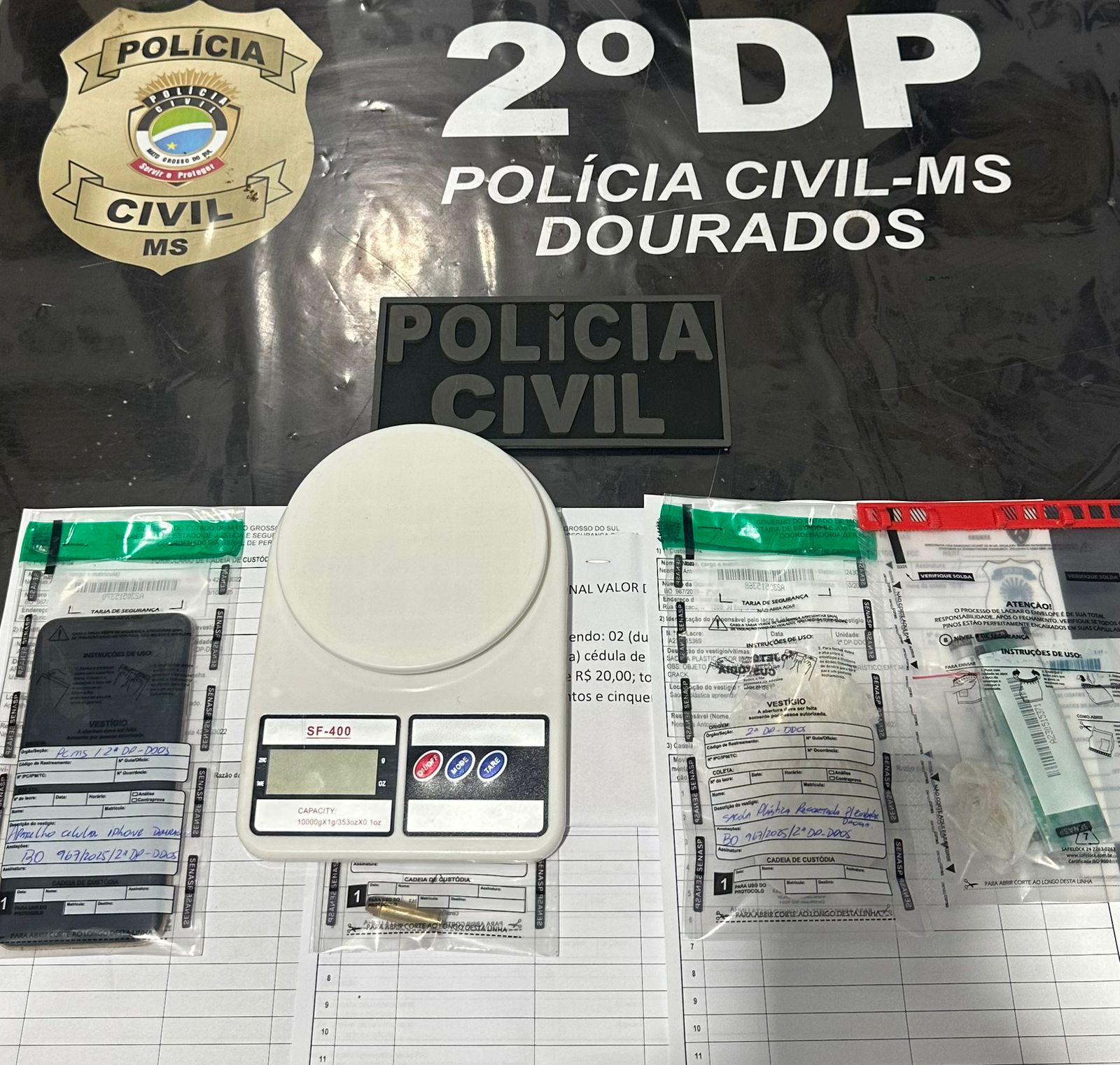 No interior da propriedade, foram descobertas 12 pedras de crack, que estavam escondidas perto da janela lateral da casa. Além disso, foram apreendidos 350,00 reais em dinheiro, uma balança de precisão, uma munição calibre .38 e um aparelho celular bloqueado.