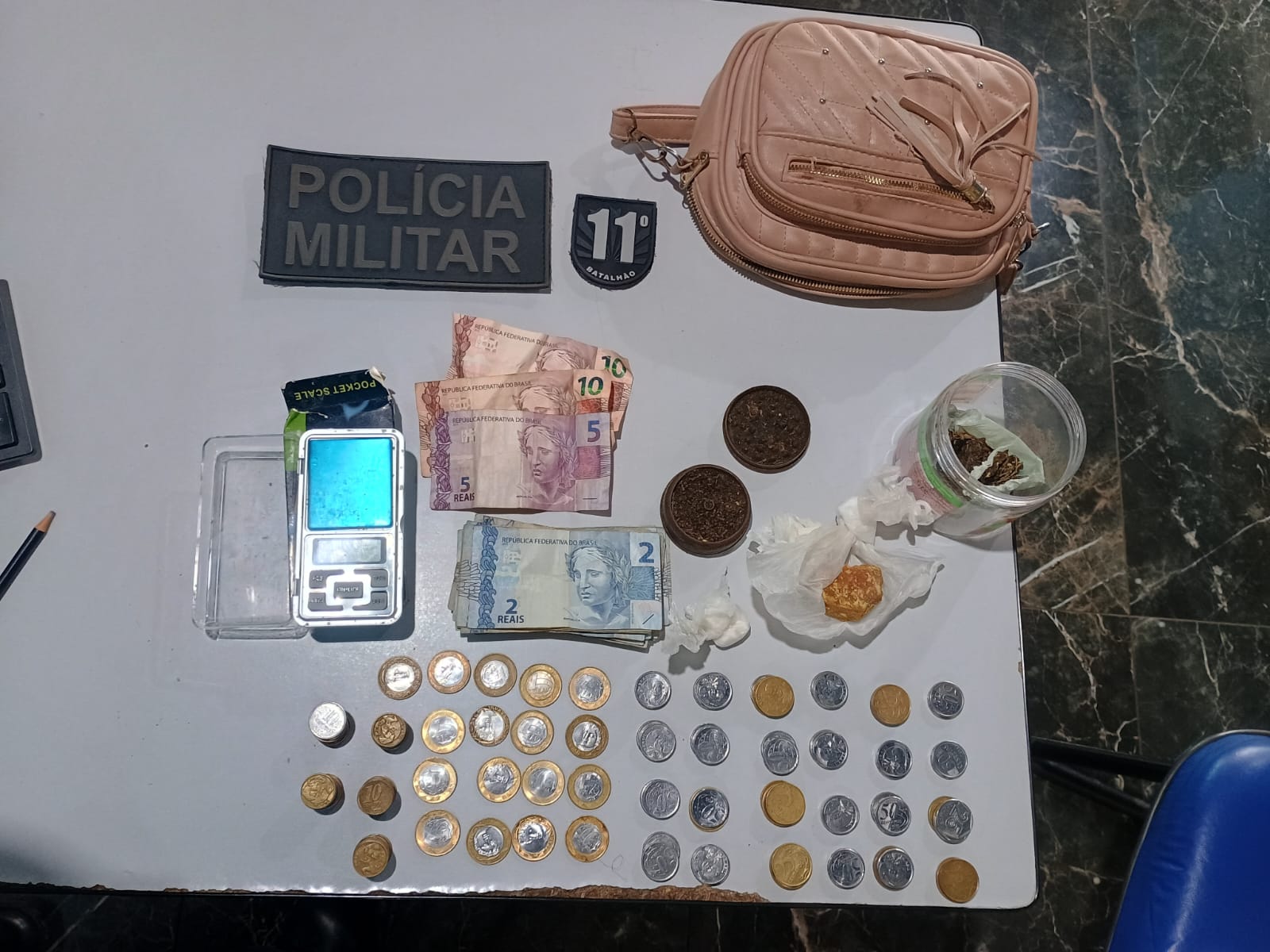 Dentro de uma cafeteira, havia diversas pedras de crack escondidas. Além disso, os policiais localizaram porções de cocaína e crack, uma balança de precisão e 147 reais em dinheiro fracionado, típico do comércio de drogas.