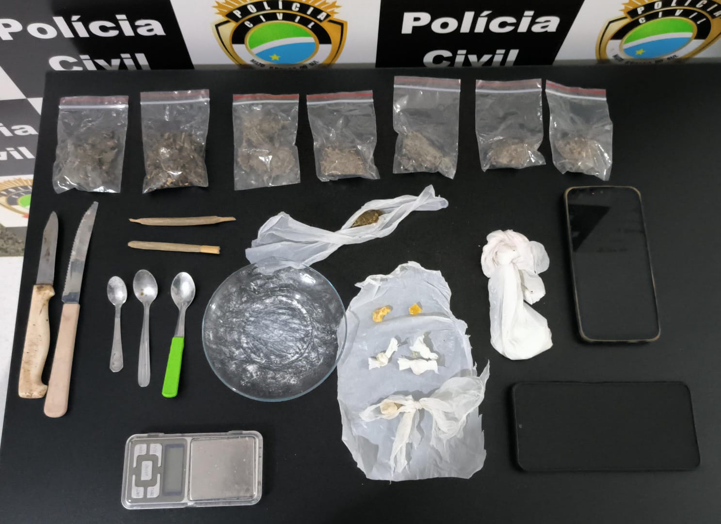 No decorrer da operação, os agentes localizaram 92 gramas de maconha, 20,2 gramas de cocaína e 4,1 gramas de pasta base. Além disso, foram apreendidas duas facas, três colheres, um prato e uma balança de precisão, todos com resíduos das drogas, indicando preparo e fracionamento para venda.
