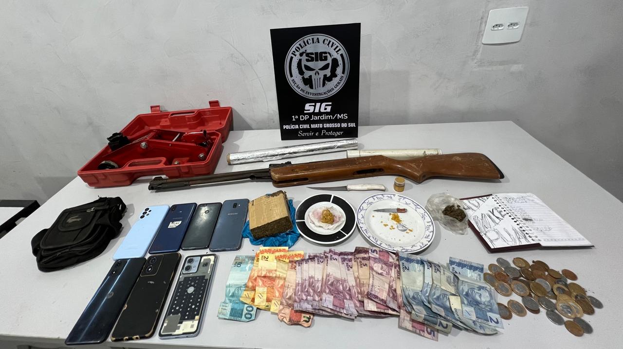 A Polícia Civil do Mato Grosso do Sul, através da 1ª Delegacia de Jardim, realizou nesta sexta-feira (24) uma operação para combater o tráfico de drogas no município. Durante a execução de um mandado de busca e apreensão em uma residência identificada como local de venda de entorpecentes, os policiais encontraram várias porções de drogas, uma quantia em dinheiro e anotações relacionadas à movimentação do comércio ilegal.